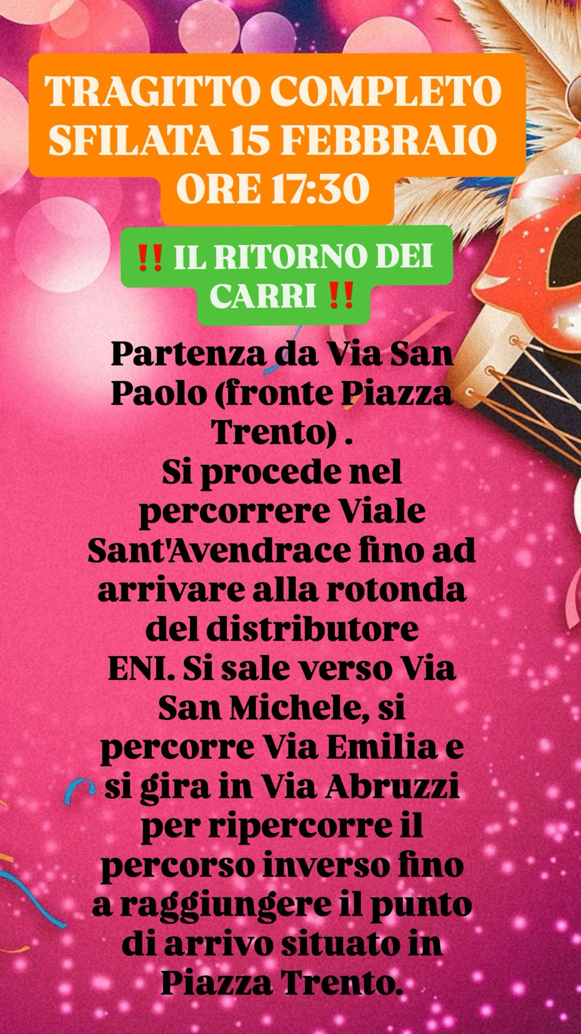 Ore 17:30 Sfilata con i Carri. Partenza da via San Paolo (tragitto: viale Sant'Avendrace, via San Michele, via Emilia, via Abruzzi e da qui percorso inverso fino a raggiungere il punto di arrivo situato in piazza Trento).