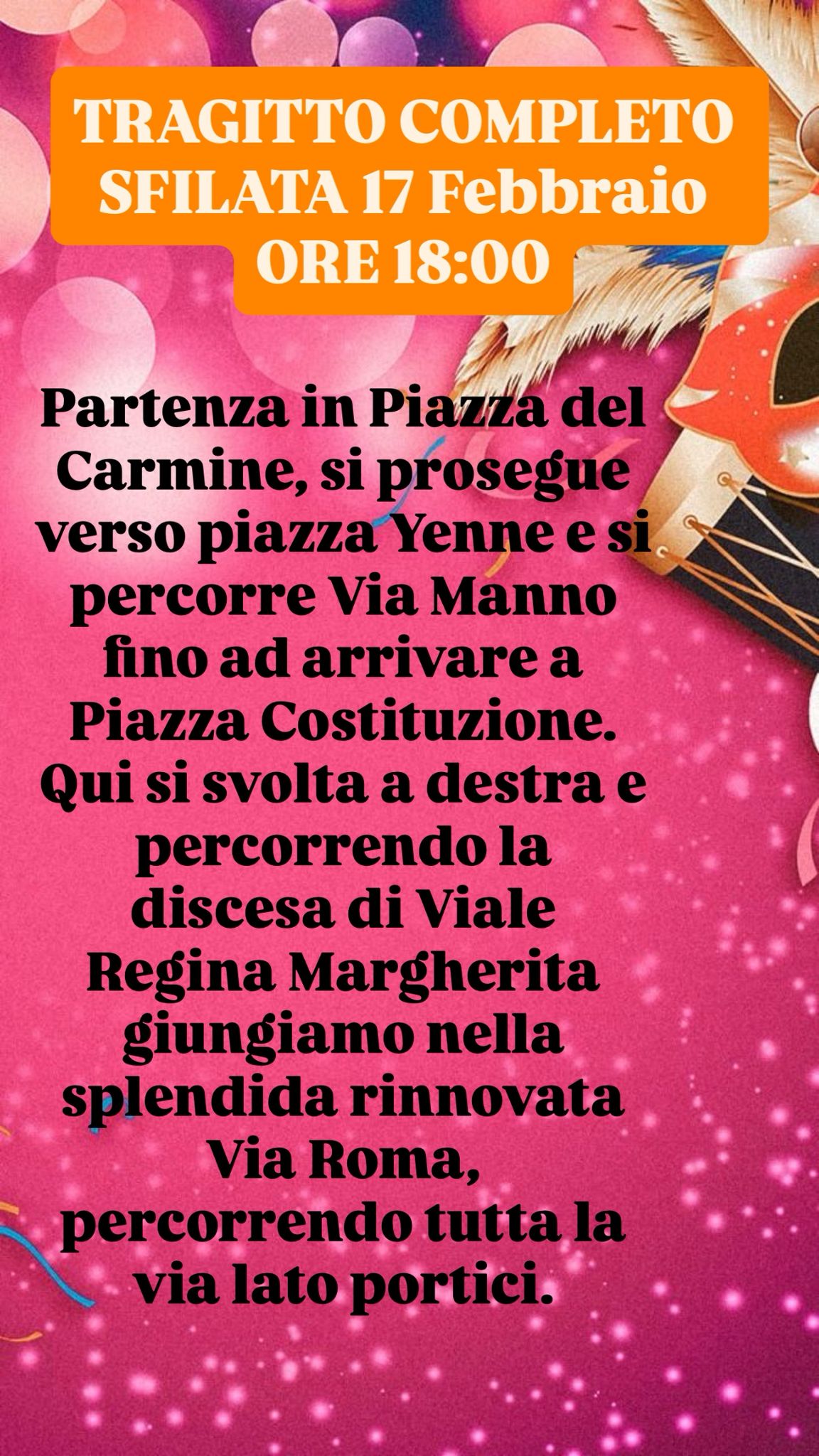 Ore 18:00 Sfilata Tradizionale Cagliaritana. Partenza da Piazza del Carmine (tragitto: piazza Yenne, via Manno, piazza Costituzione, viale Regina Margherita, via Roma).