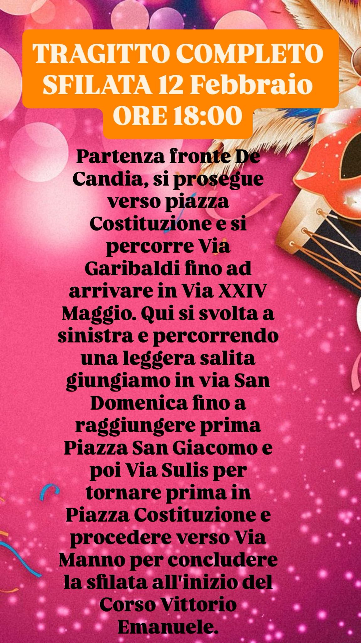 Ore 18:00 Sfilata Tradizionale Cagliaritana. Partenza da via De Candia (tragitto: Piazza Costituzione, via Garibaldi, via XXIV Maggio, via San Domenico, Piazza San Giacomo, via Sulis, Piazza Costituzione, via Manno, Corso Vittorio Emanuele II).