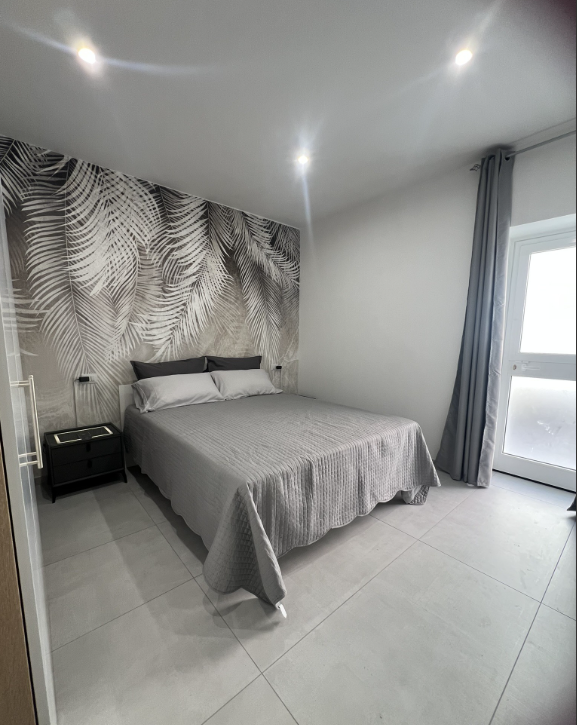 Monolocale indipendente con una camera da letto, angolo cottura, minifrigo, bagno e cortiletto con tavolo e sedie.