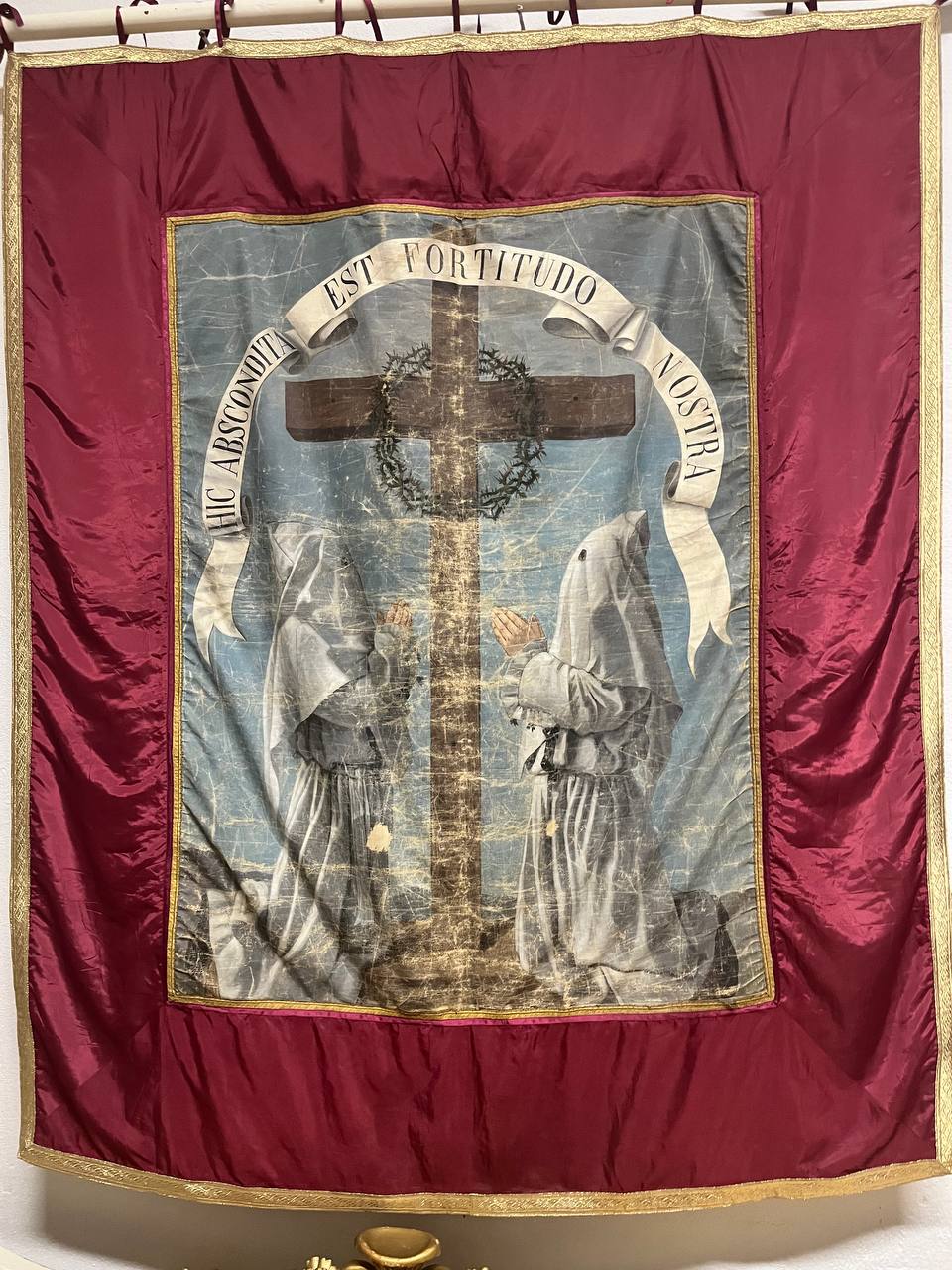 La sede dell’Arciconfraternita è l’Oratorio del Santissimo Crocifisso, edificato tra il 1665 e il 1667 sull’area attigua alla chiesa di San Giacomo. Inizialmente in esso si tenevano le riunioni dei confratelli e dal 1683 si iniziò a celebrarvi Messa. Fino al 1649 potevano far parte della Confraternita solo gli uomini, poi furono ammesse anche le donne. I confratelli indossavano una tunica bianca ornata di fasce di seta nera su maniche e collo, con cappuccio, cintura di seta bianca e un’insegna di tela sulla quale erano disegnate la croce, la corona di spine, le chiavi e il motto “Hic abscondita est fortitudo nostra” (“Qui è nascosta la nostra forza”).