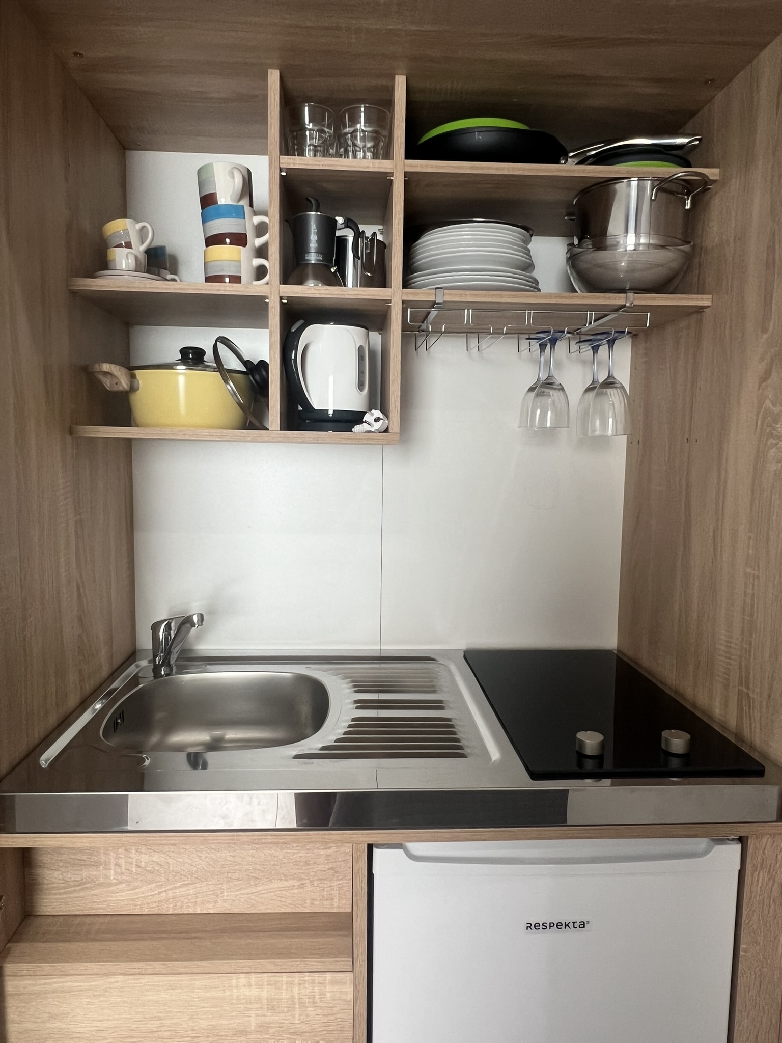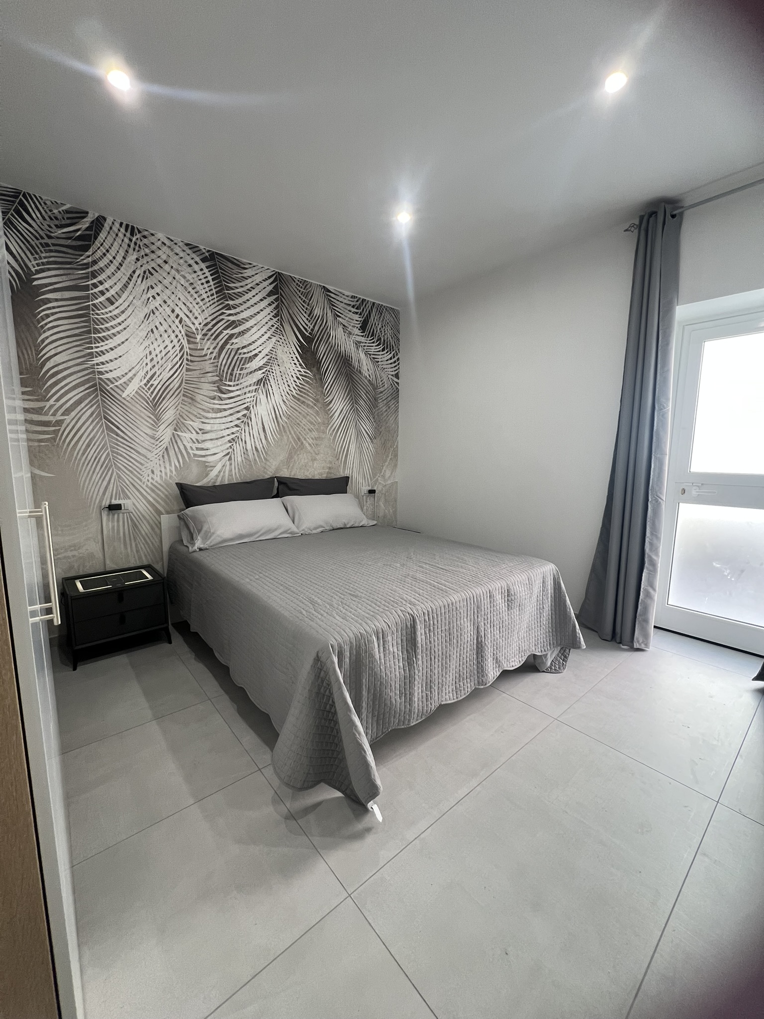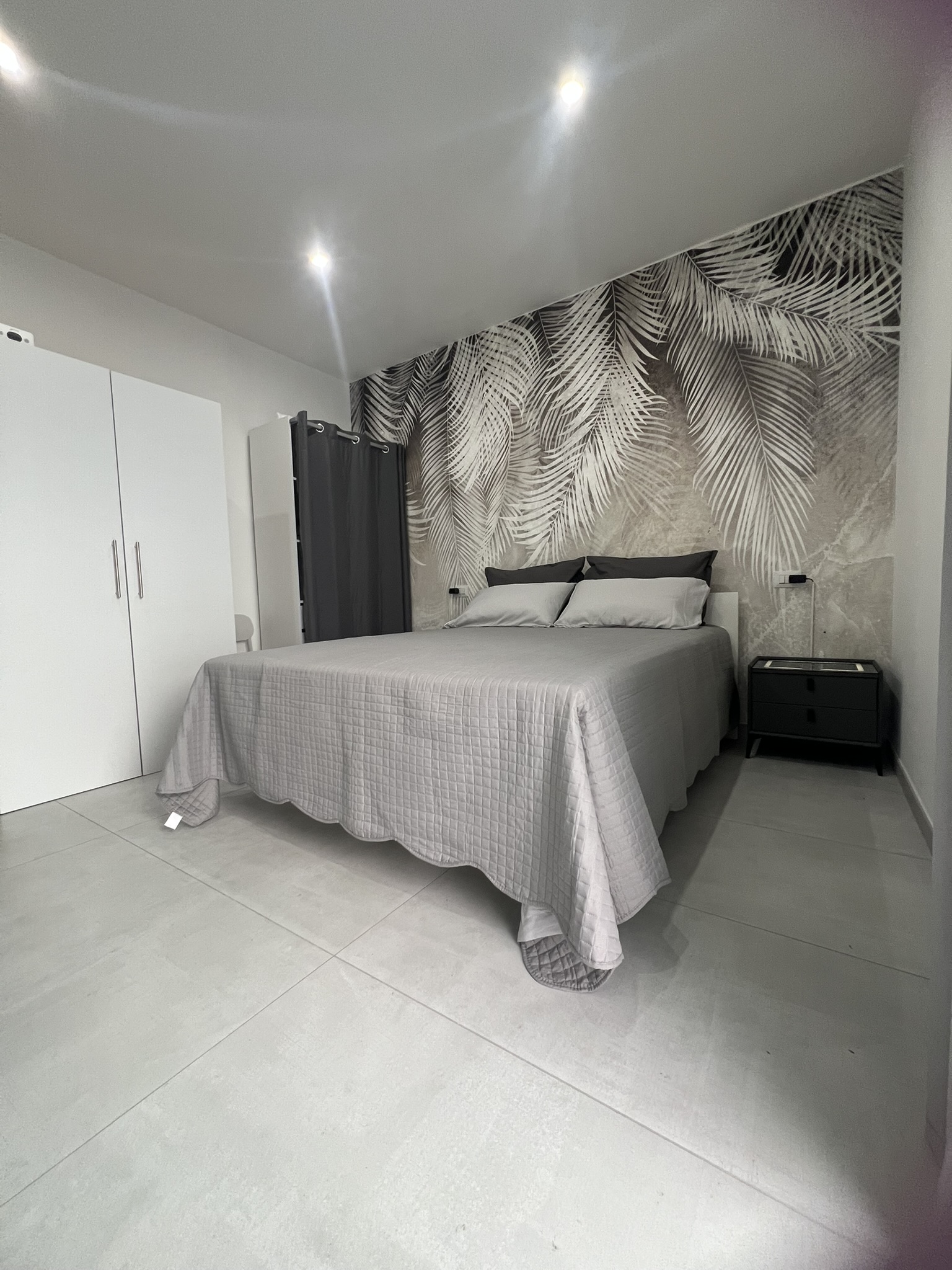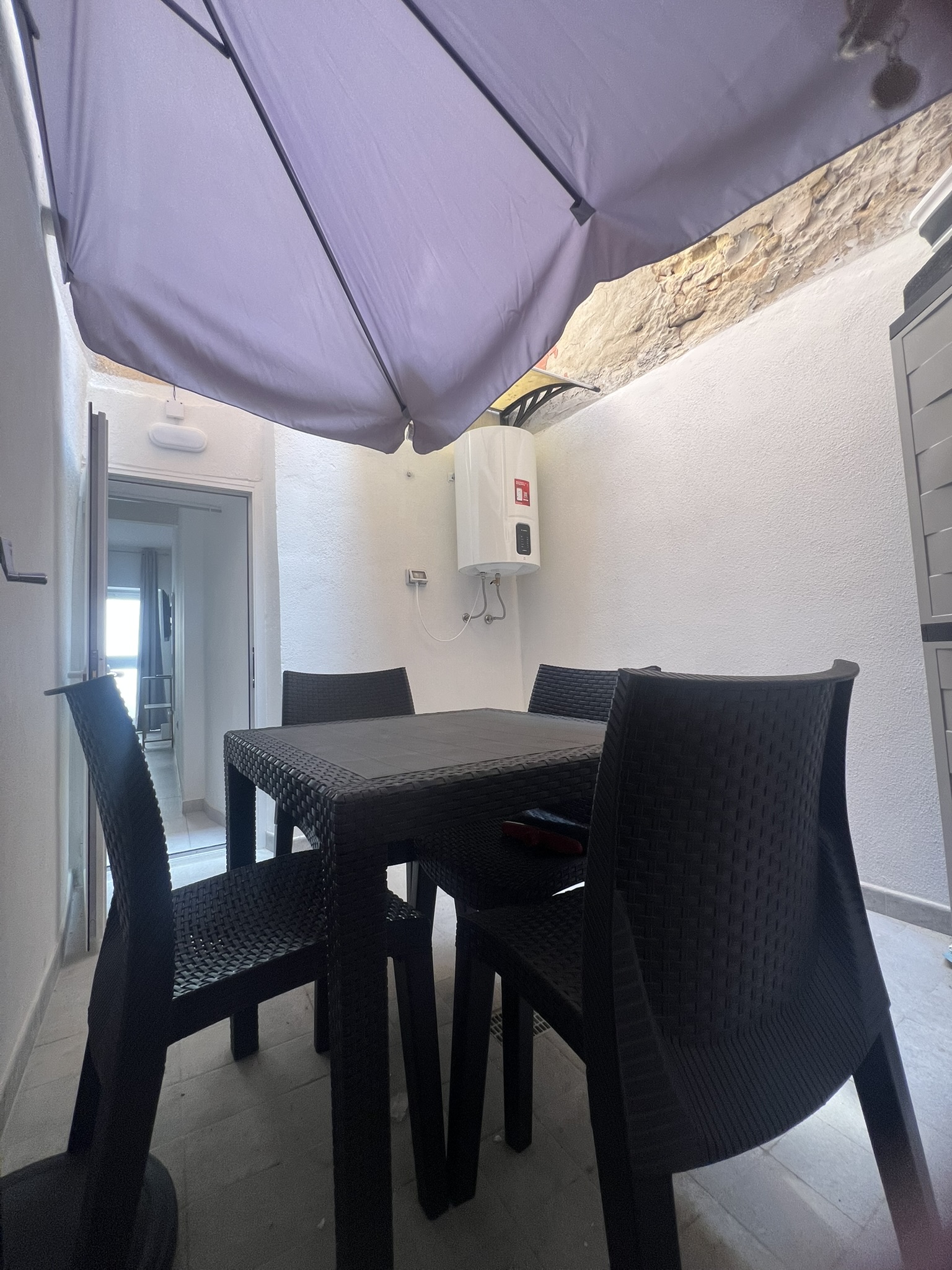 Monolocale indipendente con una camera da letto, angolo cottura, minifrigo, bagno e cortiletto con tavolo e sedie.